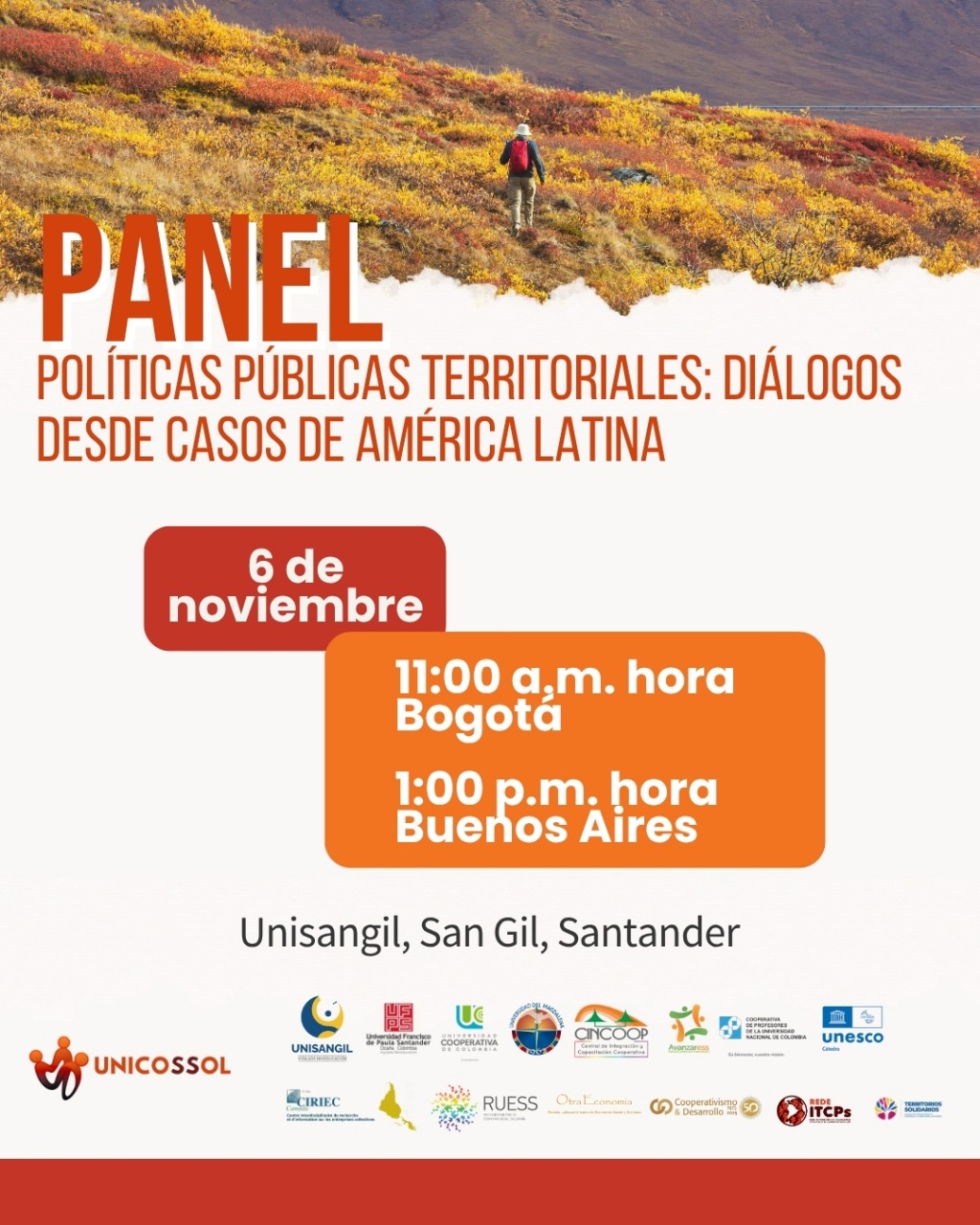 6 de noviembre 13 horas: "Políticas Públicas territoriales: Diálogos desde casos de América Latina". Panel con la participación de José Orbaiceta, Coordinador de la RMC; Claudia Gisela Jiménez Penagos, Coordinadora de la formulación de la política pública distrital de Cooperativismo y Economía Solidaria en Bogotá; Rosana Yelena Granja, Directora ejecutiva de CONFECOOP, Antioquía. Se transmitirá por facebook: https://www.facebook.com/share/17W5pFqxyZ/?mibextid=wwXIfr