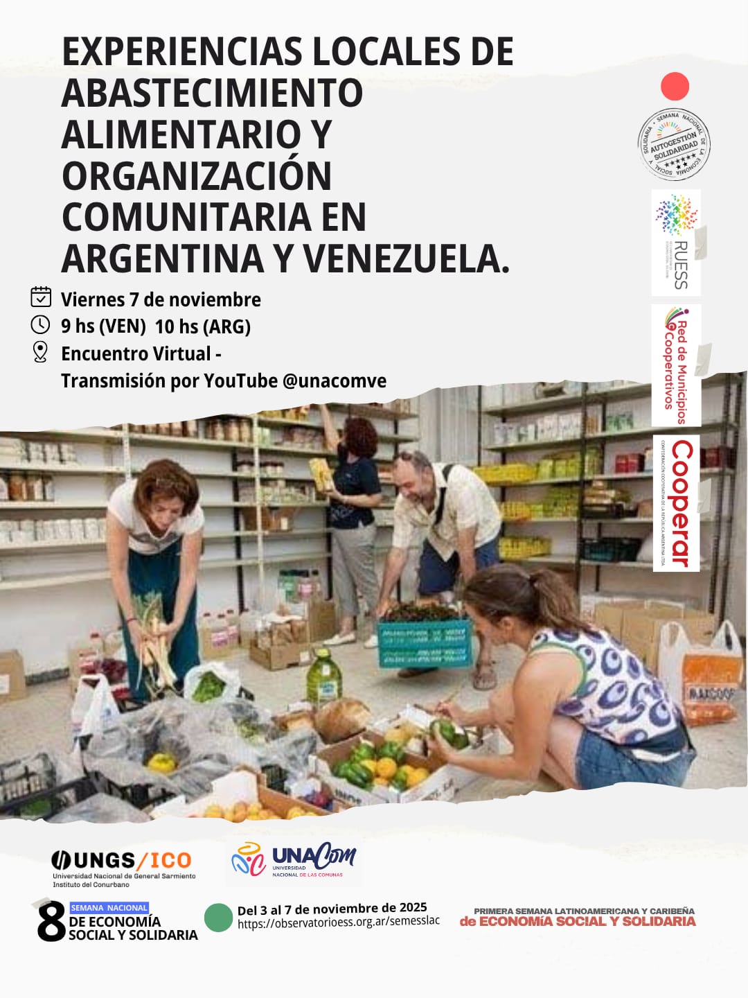 7 de noviembre 10 horas: "Experiencias locales de abastecimiento alimentario y organización comunitaria". Actividad virtual transmitida por YouTube desde el canal de la Universidad Nacional de las Comunas/ @unacomve. El Grupo de trabajo Municipios de la RUESS junto con la Red de Municipios Cooperativos/Cooperar convoca al diálogo entre experiencias locales de Venezuela y Argentina.