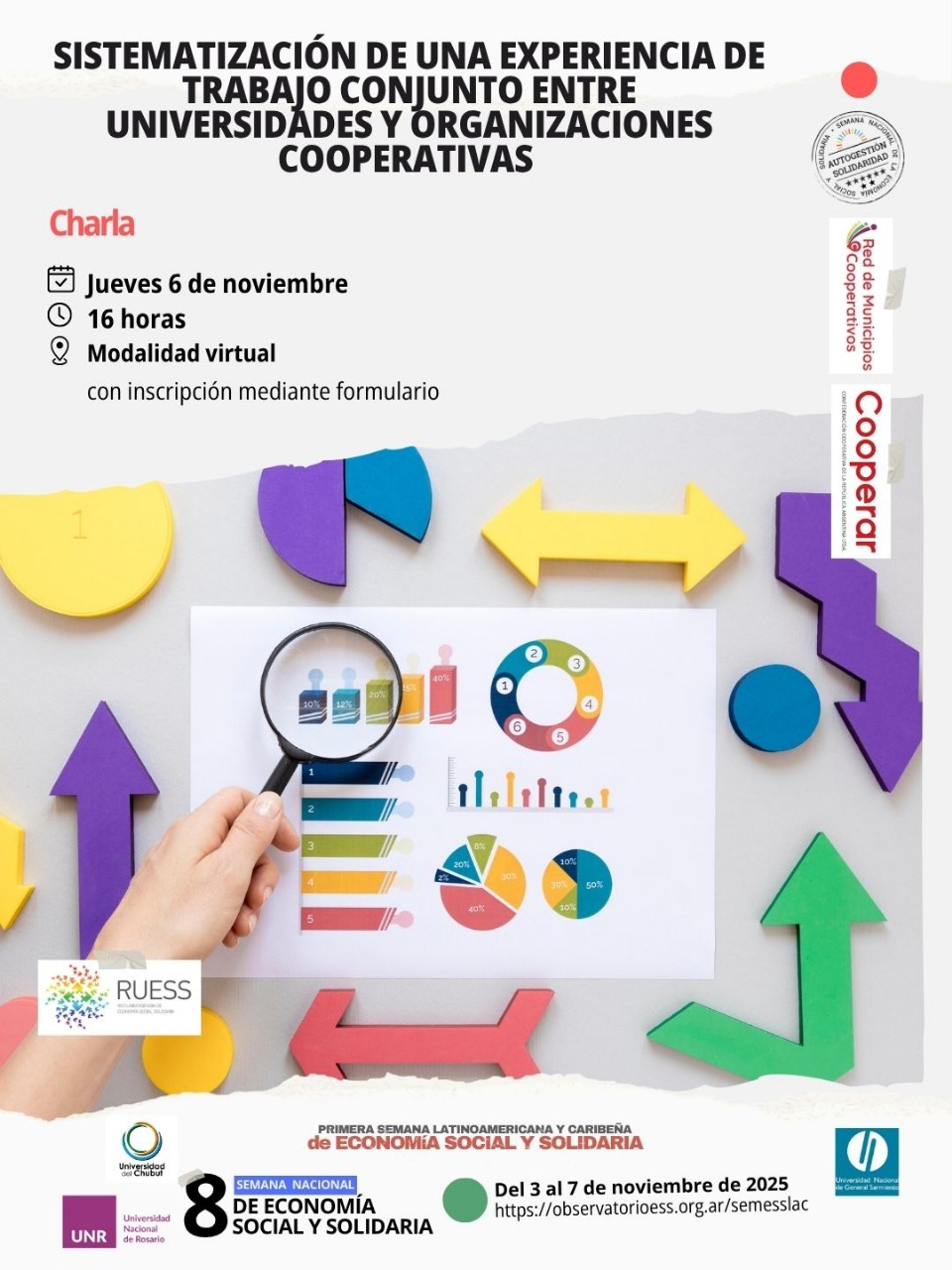 6 de noviembre 16 horas: "Sistematización de una experiencia de trabajo conjunto entre universidades y organizaciones cooperativas" (meet.google.com/ahd-bbvj-yvm). Presentación del Documento de trabajo RUESS-COOPERAR: "Cooperativas, municipios y equipos universitarios en la construcción y medición de la Economía Popular, Social y Solidaria a escala local". Se busca reflexionar sobre los efectos de la construcción colaborativa de indicadores y su relevamiento periódico sobre el seguimiento del desempeño de los municipios cooperativos, así como su potencialidad para fortalecer las capacidades estatales locales para la gestión asociativa y la planificación participativa, además de proveer información en un país que carece de producción de datos sobre el sector.