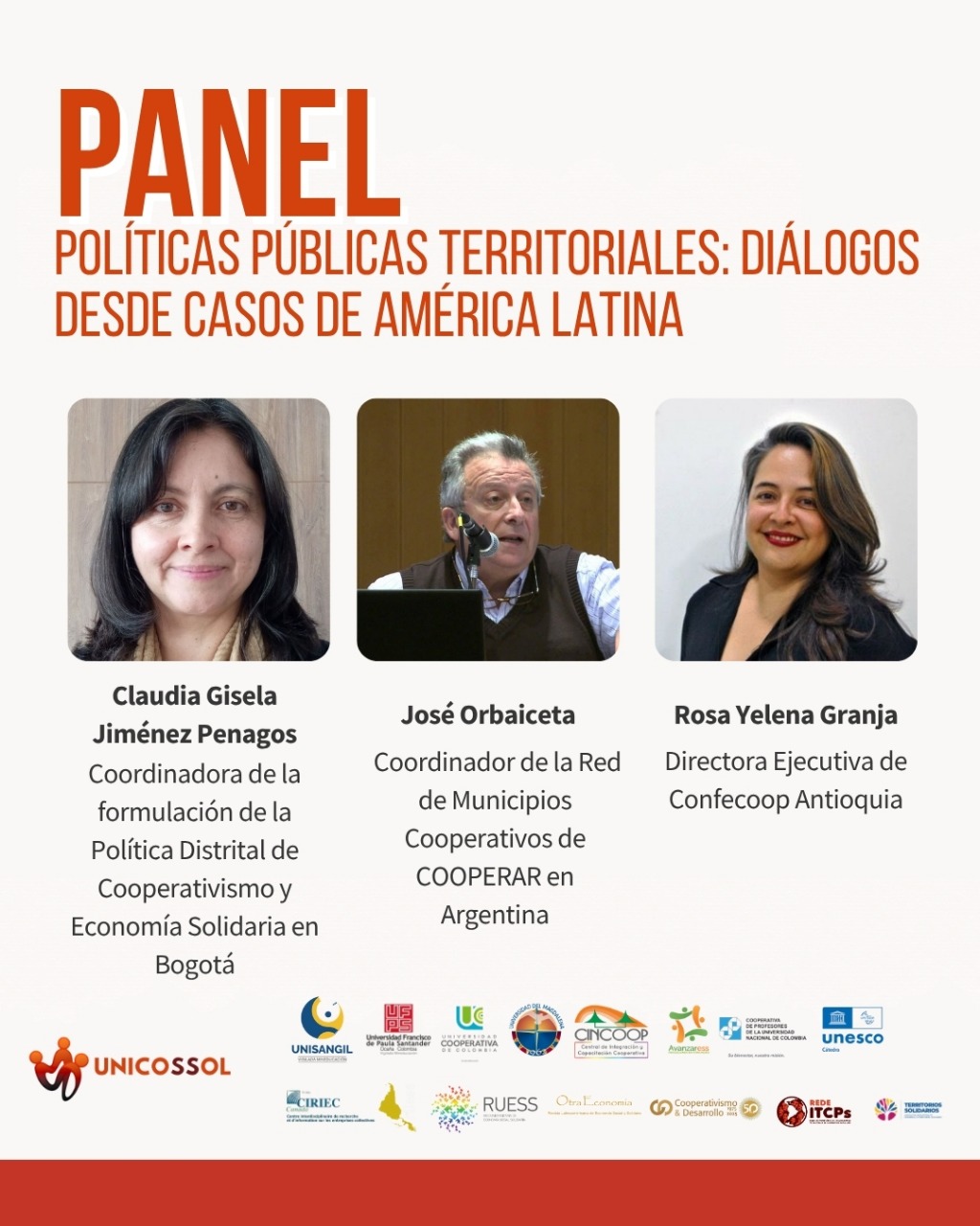 6 de noviembre 13 horas: "Políticas Públicas territoriales: Diálogos desde casos de América Latina". Panel con la participación de José Orbaiceta, Coordinador de la RMC; Claudia Gisela Jiménez Penagos, Coordinadora de la formulación de la política pública distrital de Cooperativismo y Economía Solidaria en Bogotá; Rosana Yelena Granja, Directora ejecutiva de CONFECOOP, Antioquía. Se transmitirá por facebook: https://www.facebook.com/share/17W5pFqxyZ/?mibextid=wwXIfr